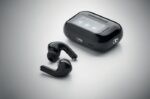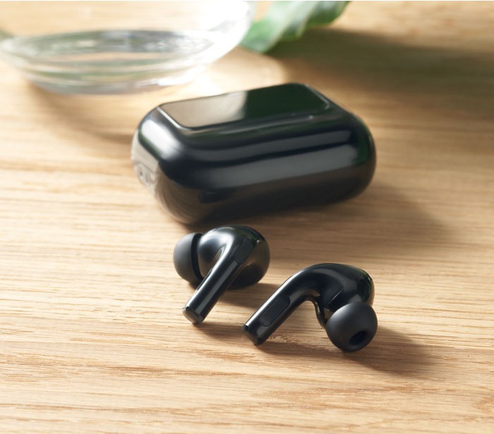 Opis: slušalke so True Wireless Stereo (TWS) 5.0 model, izdelan iz ABS plastike, ki zagotavlja stabilno bluetooth povezavo s pametnimi telefoni ali drugimi napravami. Opremljene so z aktivnim in okoljskim odstranjevanjem šuma (ANC/ENC) ter vgrajenim mikrofonom za klice ali glasovno komunikacijo. Slušalke imajo 30 mAh baterijo, ki jo dopolnjuje 230 mAh polnilna baza, ki ne le povečuje kapaciteto baterije, ampak služi tudi kot praktična, kompaktna polnilna postaja. Upravljanje je omogočeno preko touch-screen in display kontrol, kar olajša predvajanje, sprejemanje klicev in navigacijo funkcij.