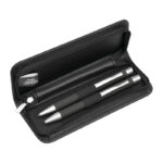 Opis: ko se eleganca sreča z vsakdanom! Kemični svinčnik z modrim jumbo polnilom in tehnični svinčnik 0,5 mm, s srebrnimi poudarki – oba usklajena v videzu in shranjena v mehkem etuiju iz recikliranega PU. Za vse, ki imajo radi lepo pisavo, dober občutek v roki in stil tudi pri zapiskih.