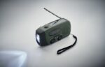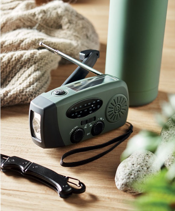 Opis: večnamenski AM/FM radio, ki omogoča sprejem radijskih postaj in s tem dostop do informacij v vsakem trenutku – doma, na poti ali v izrednih razmerah. Poleg radia vključuje LED svetilko (2 nastavitvi osvetlitve), ter 1200 mAh power bank oz. prenosno baterijo, s katero je mogoče napolniti mobilni telefon ali drugo manjšo napravo. Naprava se napaja s pomočjo solarnih celic ali ročnega dinamo mehanizma, kar pomeni, da deluje brez klasičnih baterij in zunanjega vira električne energije. Trpežno ABS ohišje in kompaktne dimenzije omogočajo enostavno prenašanje ter shranjevanje v avtomobilu, pisarni ali doma.